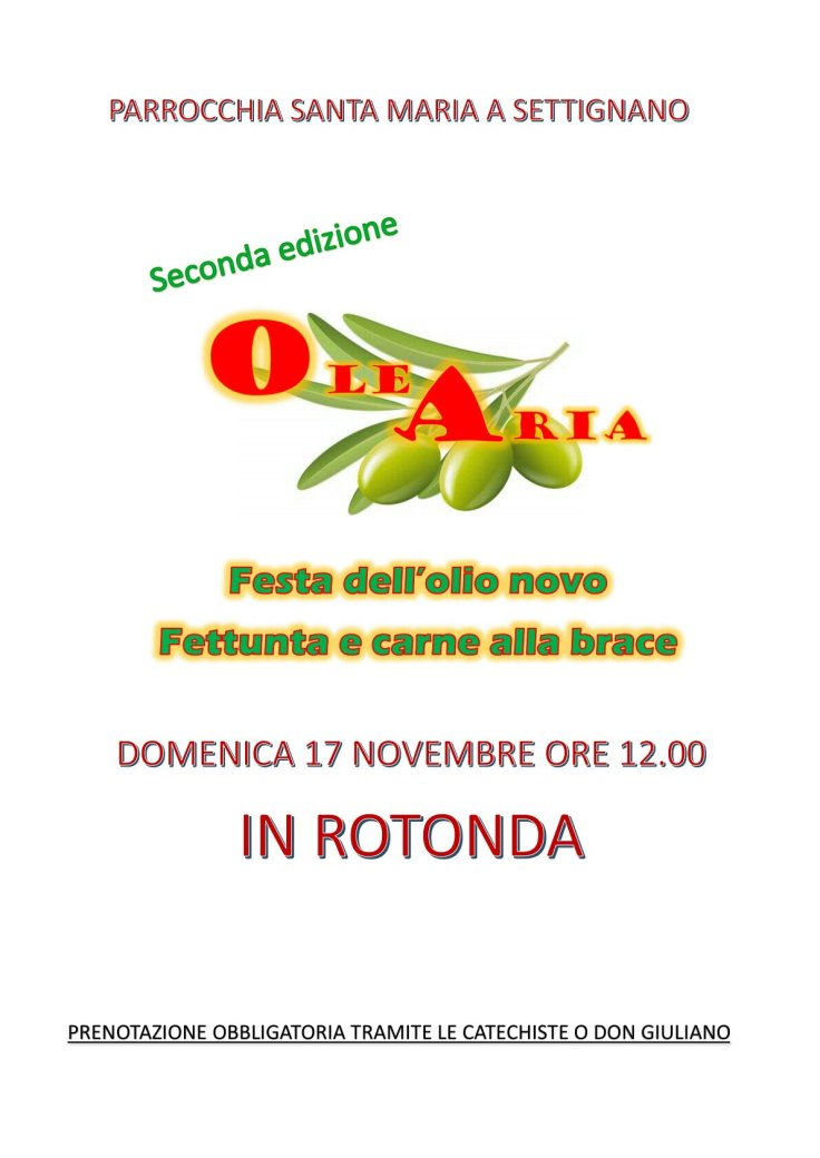 Siamo giunti alla seconda edizione di OleAria, festa dell’Olio novo, fettunta e carne alla brace. Domenica 17 Novembre ore 12 (dopo la Messa della 11) in Rotonda. Prenotazioni presso le Catechiste e Don Giuliano.