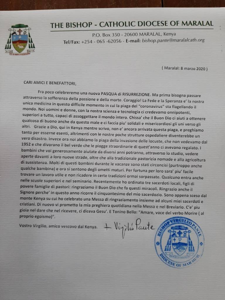 Ricorderete Mons. Ponte, il “Vescovo con l’odore delle pecore” che ha donato al Papa una mitra in pelle di capra. Ma per mons. Virgilio Pante, vescovo di Mararal, non è solo un simbolo. Lui, in mezzo ai pastori samburu ci vive davvero, da molti anni. In una terra difficile, spesso funestata dalla carestia e dagli scontri fra tribù nomadi. Invia queste riflessioni molto utili in questo tempo di grande incertezza :