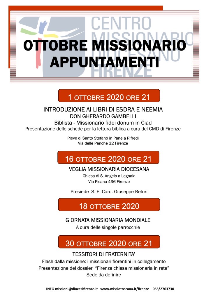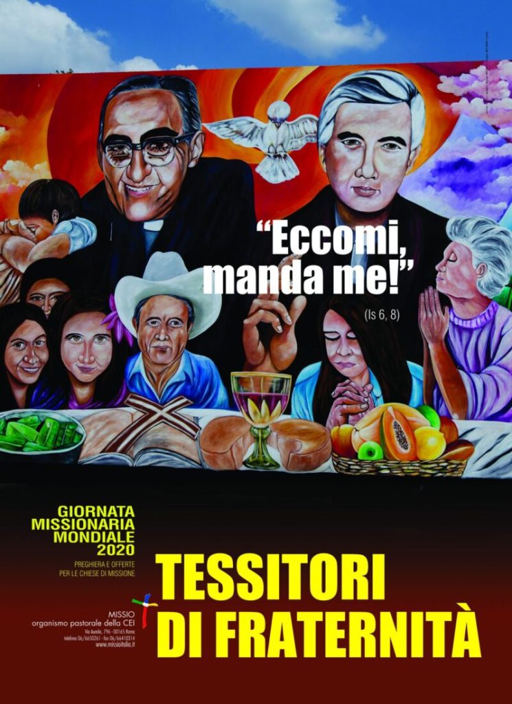 Domenica 18 ottobre si celebra in tutta la Chiesa la 96ma Giornata Missionaria Mondiale che quest’anno ha come tema “Tessitori di fraternità”. In vista dell’appuntamento e per partecipare al meglio alla Giornata il Centro Missionario Diocesano propone alcuni appuntamenti, materiali per la sensibilizzazione e suggerimenti per l’animazione liturgica (in allegato). Venerdì 16 ottobre alle 21 l’Arcivescovo presiederà la Veglia nella parrocchia di Sant’Angelo a Legnaia.