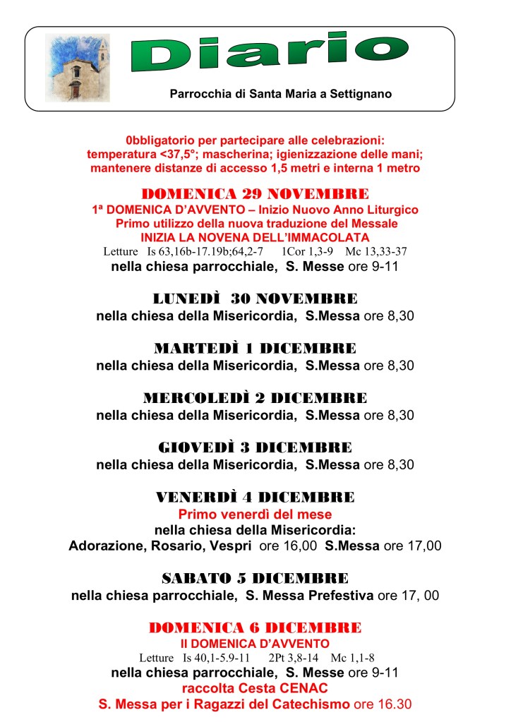 Programma parrocchiale 29 Novembre – 6 Dicembre 2020