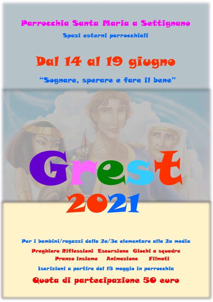 Dal 14 al 19 giugno 2021 negli spazi esterni della Parrocchia di Settignano “Sognare, sperare e fare il bene” per bambini e ragazzi dalla 2a elementare alla 2a media. Preghiere, riflessioni, escursione, giochi a squadre, pranzo insieme, animazioni, filmati. Tutto nel rispetto delle normative anti-Covid.