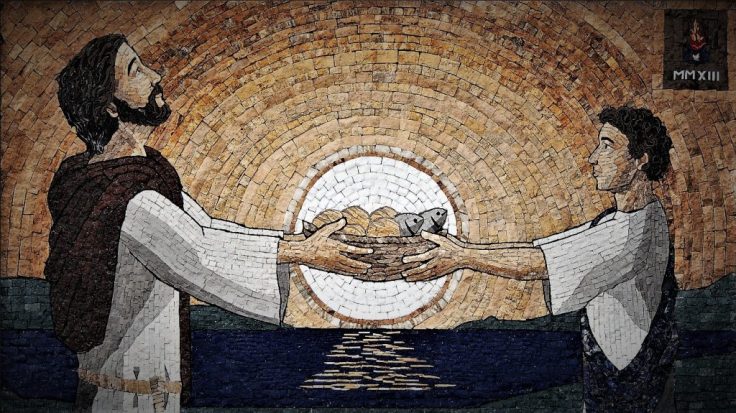 Abbandoniamo per alcune domeniche il Vangelo di Marco e ascoltiamo quello di Giovanni, in particolare il capitolo 6 riguardante i discorsi sul pane di vita, preparazione alla cena del Signore. Questa è la domenica della moltiplicazione (anche se si tratta più di una con-divisione) dei pani e dei pesci, ossia dell’unico miracolo comune a tutti i vangeli. Lo sfondo temporale di questo miracolo è la Pasqua, come annota l’evangelista, per cui occorre non dissociarlo dal pane-corpo che Gesù donerà prima della sua passione. Questo miracolo, essendo premessa al miracolo dell’Eucarestia, continua a coinvolgerci e a chiederci di cosa siamo affamati, chi e cosa può saziarci. Gesù conosce la fame dell’uomo per questo non si limita a donare quel pane, ma vi aggiunge se stesso: “chi viene a me non avrà più fame” (Gv 6,34) dirà successivamente. Alla ricerca di una soluzione per sfamare la folla, Gesù vede la Pasqua, vede il dono di se stesso, mentre i suoi discepoli rimangono legati ai calcoli e alle loro impossibilità. Gesù trasforma il poco in molto per insegnare il gesto della condivisone rivestita di fiducia e speranza per sottolineare l’efficacia di piccoli gesti compiuti per amore verso il prossimo. Se ci pensiamo, in vari brani della bibbia tutto inizia dal poco, come le monete della vedova, come la giovinezza di Davide o di Maria: è necessario fidarsi e metterci nelle mani di Dio. Questa prima parte del Vangelo è indicazione di chi solo può completare l’umanità, va vista, letta e meditata affinché riconosciamo in Cristo l’appagamento della nostra esistenza. Il Signore basta e avanza nel colmare ciò di cui è mancante l’umanità. Riusciamo a cogliere nell’Eucarestia Colui che ci sfama in modo sovrabbondante tanto da essere comunicato ancora agli altri? Avanzano dodici ceste, una per ogni discepolo, una per ciascuno di noi perché ognuno possa continuare nella vita quell’evento. La seconda parte del Vangelo è anch’essa significativa, ma rischia di essere fraintesa e trascurata. Si tratta della fuga di Gesù dalla folla che, appena nutrita e alla vista di tale miracolo voleva farlo re. La grandiosità del miracolo che saziò un tipo di fame, allo stesso tempo rese cieca la folla a tal punto da renderla serva di quel potere per una finalità “politica”. La fuga di Gesù è comprensibile e diventa monito ai cristiani e alla chiesa affinché essa non si serva mai dei bisogni dell’umanità per sottometterla, ma agisca come Gesù, servendola donandosi. Quella di Gesù è fuga da un potere che non è il suo, Egli fugge dal potere degli uomini, un potere che genera ingiustizie, fame e morte, al contrario del suo che consiste nel farsi povero e piccolo con i poveri e i piccoli di questo mondo; il suo è il potere del servizio e della comunione. Gesù non è il maghetto di turno che trasforma le cose e che può essere usato come il genio della lampada; Gesù ti invita a condividerti, perché ti ritiene capace di fare come lui, nell’alleviare qualsiasi fame delle persone a te vicine.