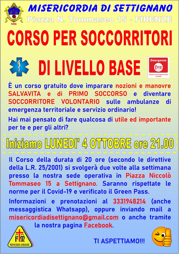 Il Corso della durata di 20 ore (secondo le direttive della L.R. 25/2001) si svolgerà due volte alla settimana presso la nostra sede operativa in Piazza Niccolò Tommaseo 15 a Settignano. Saranno rispettate le norme per il Covid-19 e verificato il Green Pass.Informazioni e prenotazioni al 3331948214 (anche messaggistica Whatsapp), oppure inviando mail a misericordiadisettignano@gmail.com o anche tramite la nostra pagina Facebook.