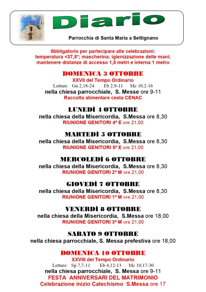 Diario della Parrocchia dal 3 al 10 Ottobre 2021