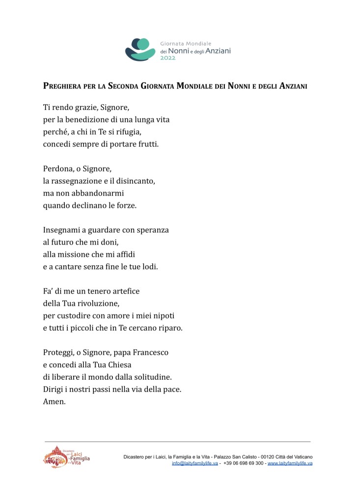 Oggi Domenica 24 Luglio 2022 si celebra la seconda domenica mondiale dei Nonni e degli Anziani. Vi proponiamo questa bella preghiera che potete anche scaricare tramite il link in basso :