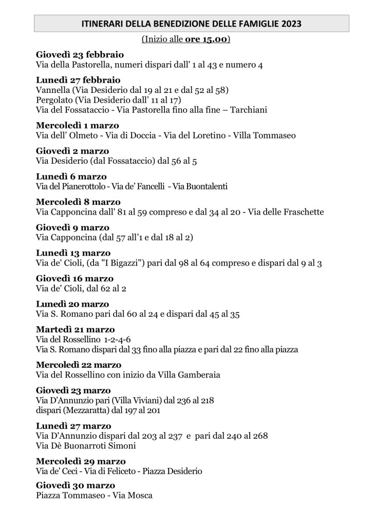 BENEDIZIONE DELLE FAMIGLIE 2023 Questo il calendario per la Benedizione delle Famiglie 2023 Condividi: Condividi su X (Si apre in una nuova finestra) X Condividi su Facebook (Si apre in una nuova finestra) Facebook Mi piace Caricamento... Correlati Lascia un commento Cancella risposta Δ