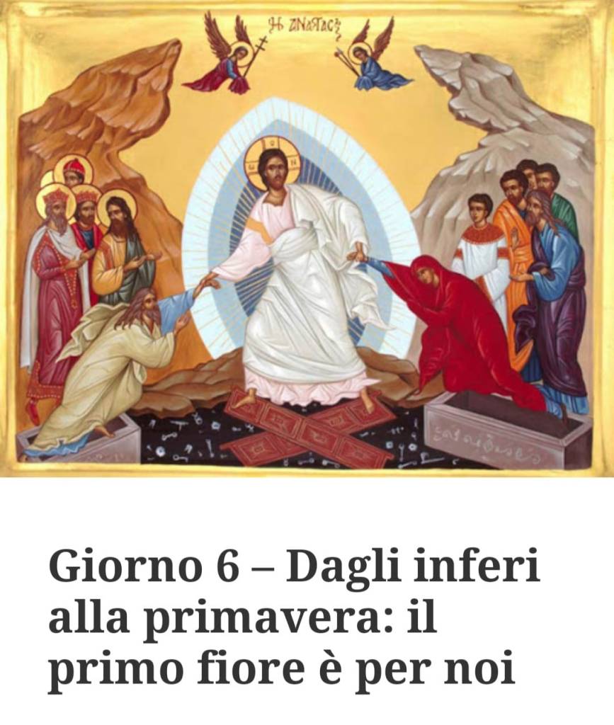 Le icone orientali, invece, raccontano Gesù che scende “con braccio forte e mano tesa”, nel mondo misterioso dei trapassati (gli inferi, o Ade), per liberare dalla morte Adamo ed Eva e il popolo dei giusti, come un tempo era sceso in Egitto per liberare il popolo d’Israele dalla schiavitù.