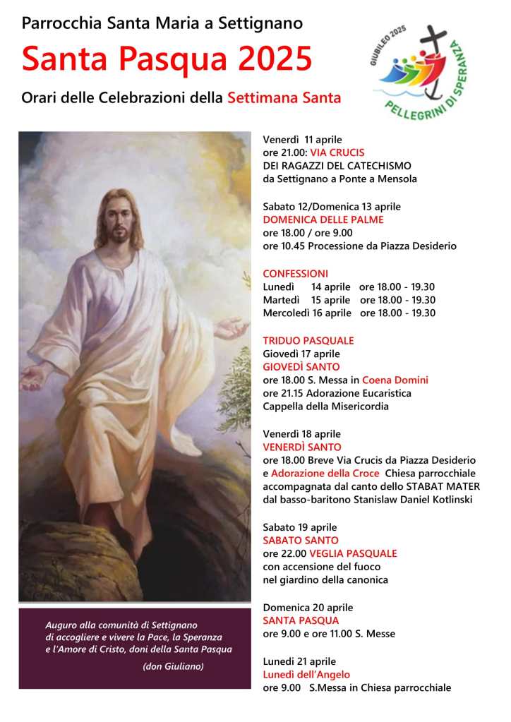 SANTA PASQUA 2025 Programma della Settimana Santa della nostra Parrocchia : Condividi: Fai clic per condividere su X (Si apre in una nuova finestra) X Fai clic per condividere su Facebook (Si apre in una nuova finestra) Facebook Mi piace Caricamento... Correlati Lascia un commento Cancella risposta Δ